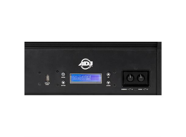 The fixture has DMX-512 and RDM protocols, a USB service port, a 4-Button control panel LCD menu display, 3 & 5-pin DMX In/Out sockets and locking power In/Out to daisy chain power from one fixture to another.
