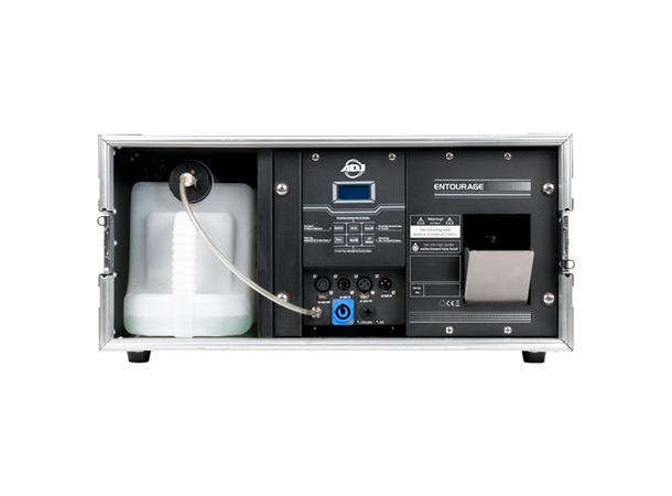 The ADJ Entourage is a professional grade touring Faze Machine built into a durable flight case. This pro Fazer offers a very quick warm-up time and produces a massive amount of atmosphere. The Entourage features an easy to read LED function display with fog timer, continuous fog and manual fog options. Connections include 3-pin and 5-pin DMX and Locking Power AC input. Uses high quality water based fog fluid.