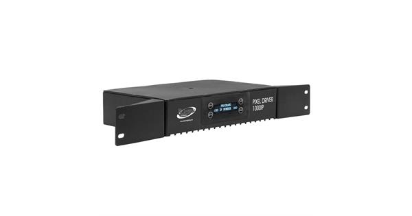 The Pixel Driver 1000IP features a rugged IP65 housing, universal auto switching power supply (100-240v), a 4-button LCD control menu display, RJ45 Ethernet in/out ports, and (4) outputs which use proprietary IP65 rated 4pin combo cables (sold separately) that supply power and data to each pixel bar, (available in lengths from 0.6 to 15 meters). The Pixel Driver 1000IP can be mounted in a standard 19-inch rack (rack ears included) or attached to truss with a clamp (not included).